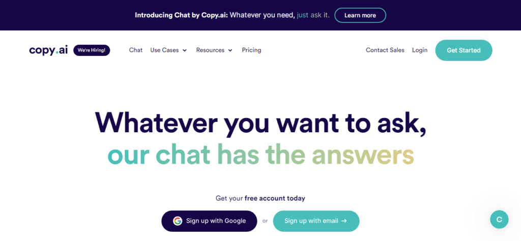Copy.ai is a tool that uses artificial intelligence to generate top-notch content for different types of contents like articles, descriptions for products, posts on social media and advertising material.