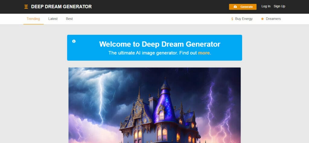 Deep Dream Generator is an internet-based application which utilizes artificial intelligence to produce artistic images. It provides the option to either upload your own image or choose one from the website, and then apply various styles and effects to it.